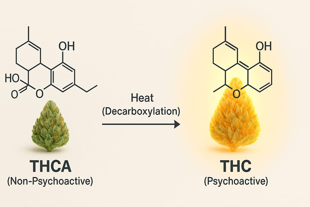The critical difference lies in a chemical reaction called decarboxylation. When raw cannabis is exposed to heat—through smoking, vaping, or cooking—the THCA molecule loses a carboxyl group and is converted into psychoactive Delta-9 THC.